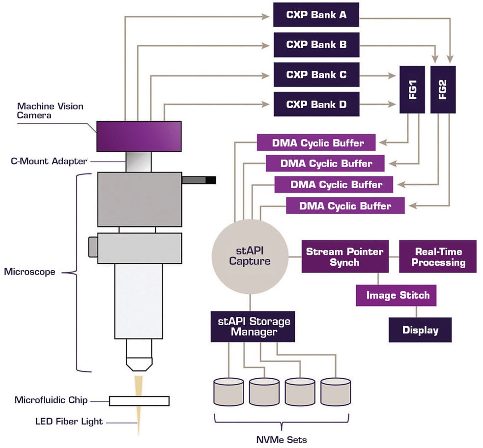 Several commercially available image cytometers can perform such characterizations with throughputs on the order of thousands of cells per second. But these technologies are unable to process data at high speeds, eliminating the ability to run real-time feedback loops that are critical for future artificial intelligence (AI) and machine learning applications. This article illustrates how off-the-shelf hardware — i.e., camera, frame grabbers, processors — and software can be integrated to process individual cells in real time with microsecond latencies at high framing speeds (10–100 kfps) and ultra-short exposure times. This system can be designed to make inferences derived from images on the order of microseconds, providing a basis for executing microsecond and microscale decisions on the individual cells.
