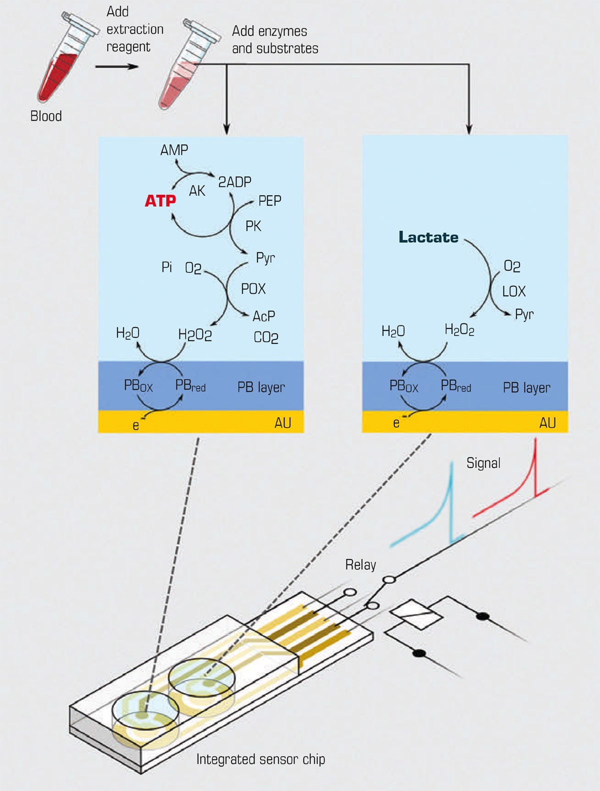 Ishida and colleagues at Hokkaido University and Tokushima University developed a biosensor that can detect levels of ATP and lactate in blood with great high sensitivity in as little as five minutes. The process is straightforward. Chemicals are added to a blood sample to extract ATP from red blood cells. Enzymes and substrates are then added to convert ATP and lactate to the same product that can be detected by specially modified electrodes on a sensor chip. The intensity of the current generated at the electrodes depends on the amount of by-product present in the sample.