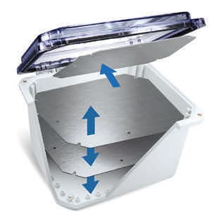 Bud Industries, Cleveland, OH, has introduced a series of heavy-duty plastic enclosures that are designed to provide flexibility in installing printed circuit boards and other components. The DPS and DPH series enclosures have provisions for mounting panels in the base, cover, and anywhere between via mounting channels. The DPS series features a screw-down cover; the DPH series features a hinged cover. All models have the option of a clear or opaque cover. Each series comes in nine sizes ranging from 7.04 × 5.04 × 4.83 in. to 13.24 × 11.20 × 7.70 in. The corrosion-resistant enclosures are made of thick UV-rated polycarbonate plastic.