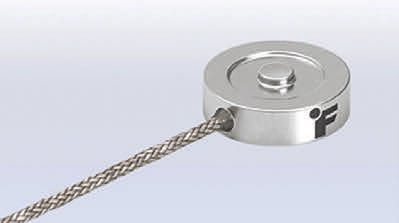 A miniature load button is available from FUTEK, Irvine, CA. The LLB250 can measure compression forces up to 250 lbs with a footprint of just 0.5 in. (12.7 mm) diameter and 0.15 in. (3.9 mm) in height. It features a custom single-gauge design for robust integration with the sensor case and very high accuracy and reliability. The single-gauge design eliminates inter-gauge wiring. A customized strain element allows increased strain measurement around the active sensor element that reduces reproducibility errors and installation mishaps. The sensor is designed for press or in-line compression applications. The sensor has a highly flexible 34 AWG, 4-conductor, 5-ft (1.5 m) long-braided shielded cable. Custom sensor versions can be optimized to meet specific requirements.