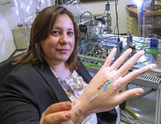 Researchers have developed three-in-one hybrid material smart skin for the next generation of artificial, electronic skin using a novel process. With 2,000 individual sensors per square millimeter, the hybrid material is even more sensitive than a human fingertip. Each sensor consists of a unique combination of materials: a smart polymer in the form of a hydrogel inside and a shell of piezoelectric zinc oxide.