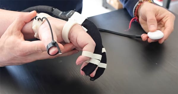 The Emovo Grasp device consists of two patented, artificial tendons resembling thin cables inserted into a sheath. They attach along the back of the hand using silicon rings placed on each finger. The motor and the remote control, which lets the user adjust the force being applied, are in small, separate cases. This design frees up the palm of the hand and the tips of the fingers to maximize sensory input.