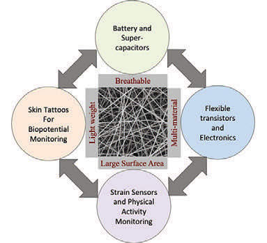 Researchers have shown that electrospun materials have many advantages over conventional bulk materials for the development of wearables. Electrospun materials’ high surface-to-volume ratio endows them with enhanced porosity and breathability, which is important for long-term wearability. Also, with the appropriate blend of polymers, they can achieve superior biocompatibility.