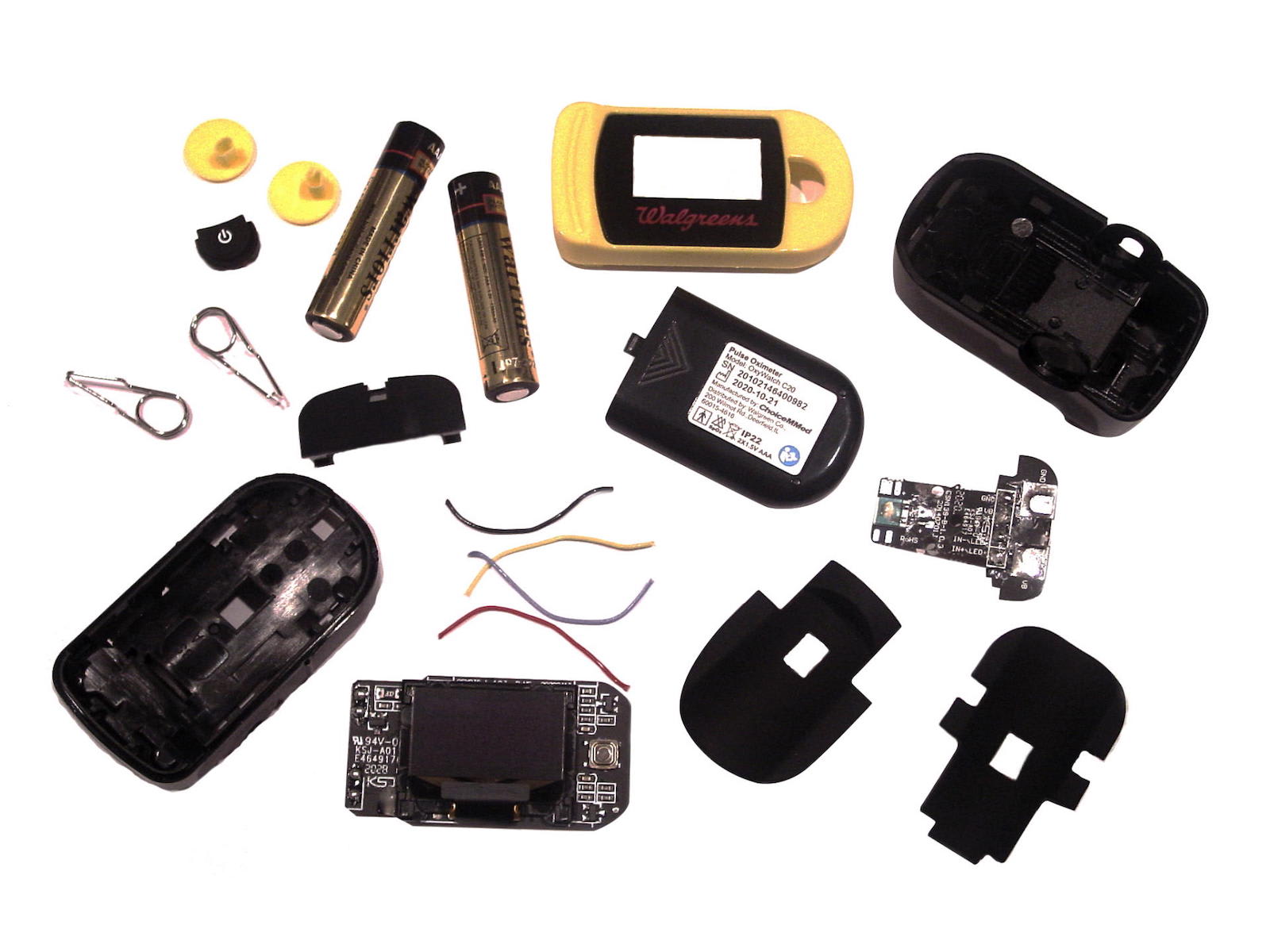 Widely used through the COVID-19 pandemic, pulse oximeters employ light beams to estimate blood oxygen saturation and pulse rate without the need to draw blood samples. The following cost study focuses on an off-the-shelf, consumer-grade device from Walgreens. We performed a detailed cost analysis of every single component that makes up the device — right down to the labels. For the pulse oximeter, the analysis broadly fell into two device categories: the mechanical components and the electronics.