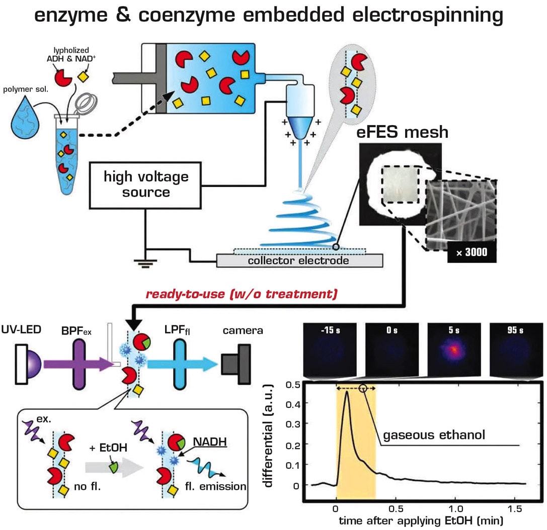 Now, a collaborative team of researchers from Tokyo Medical and Dental University (TMDU) and Waseda University led by Professors Kohji Mitsubayashi and Naoya Takeda created a noninvasive biosensor for volatile organic compounds in the form of a solid mesh. A solution of polyvinyl alcohol was first combined with the enzyme alcohol dehydrogenase and the coenzyme nicotinamide adenine. The mixture was forced through a nozzle at a high voltage. Thin fibers of polymer accumulated on the collector plate, with the enzyme embedded inside, until a solid mesh was obtained. The presence of ethanol vapor could be detected based on a significant increase in fluorescent activity.