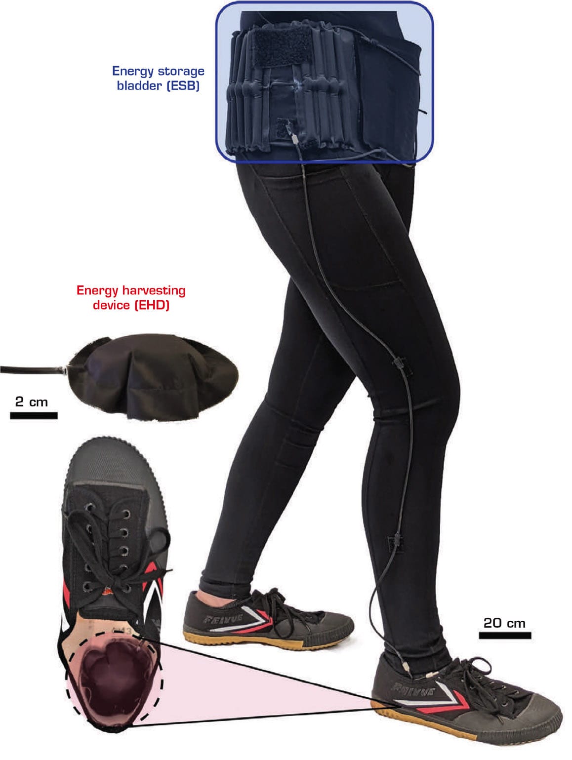 The system requires two components: textile pumps embedded in the soles of walking shoes that harvest air pressure and pneumatic actuators that make use of that pressure where needed. The pumps are filled with open-cell polyurethane foam that allows them to recover their shape after every footfall.
