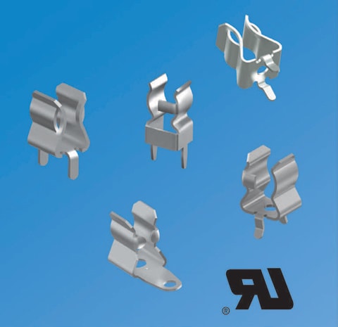 Keystone Electronics Corp., New Hyde Park, NY, offers UL-recognized fuse clips with end stops to ensure safety and design integrity. Available for use with 1AG through 8AG size cylindrical glass fuses, the low-profile, space-saving fuse clips can accommodate any product design requiring UL components. Clips are suitable for applications from 6 to 30 A in a variety of environments. The clips are manufactured from brass with tin or nickel plate to ensure low contact resistance and ease of use on PCBs. Designed to mount easily and retain a stable position during wave soldering, the clips are available in snap-in and pressin through-hole mounting configurations as well as rivet and surface-mounting styles.