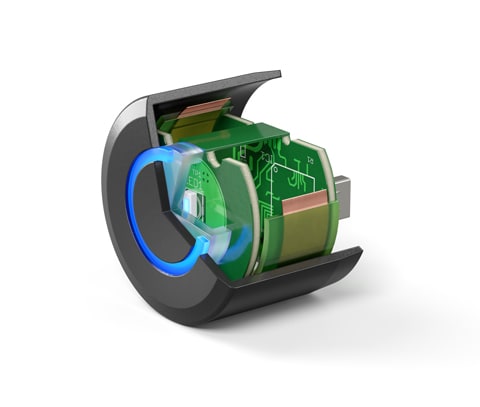 EBE, Leinfelden-Echterdingen, Germany, has developed a rotary encoder with no mechanical parts. Based on the company’s capacitive capa-TEC® technology, the rotary encoder is set by a sliding movement of several fingers across a cylinder. The operator’s fingers serve as individual influencing factors that can be detected via capacitive measurement. Electrodes introduced from within are adjusted inside the rotary encoder via a carrier element. The housing wall remains completely closed and contains no mechanical or otherwise rotating components. The capacitive rotary encoder is particularly suitable in environments that need to be regularly cleaned or disinfected.