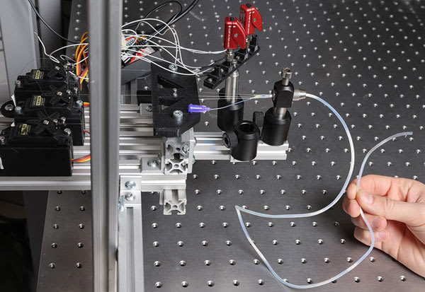 The researchers created the fibers with the thermal drawing process commonly used to produce fiber optic cables, similar to pulling a long string of cheese from a fondue and letting it harden. Material choice was critical, with elastomers — elastic polymers that return to their original shape when stretched — the preferred candidate: In addition to being flexible, they are soft enough to minimize lesions of delicate body tissues.