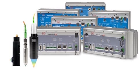 A confocal chromatic measuring system from Micro-Epsilon, Raleigh, NC, is used for fast distance and thickness measurements. The confocalDT is available in different sensor models and controller interfaces. The confocal chromatic measuring principle enables high precision displacement and distance measurements even on diffuse and reflecting surfaces. Very small objects can be detected due to the small measurement spot size. The axial beam path avoids shadowing effects, enabling measurements even in sleeves and recesses. With the 90° version, geometrical features can be measured inside holes and recesses.