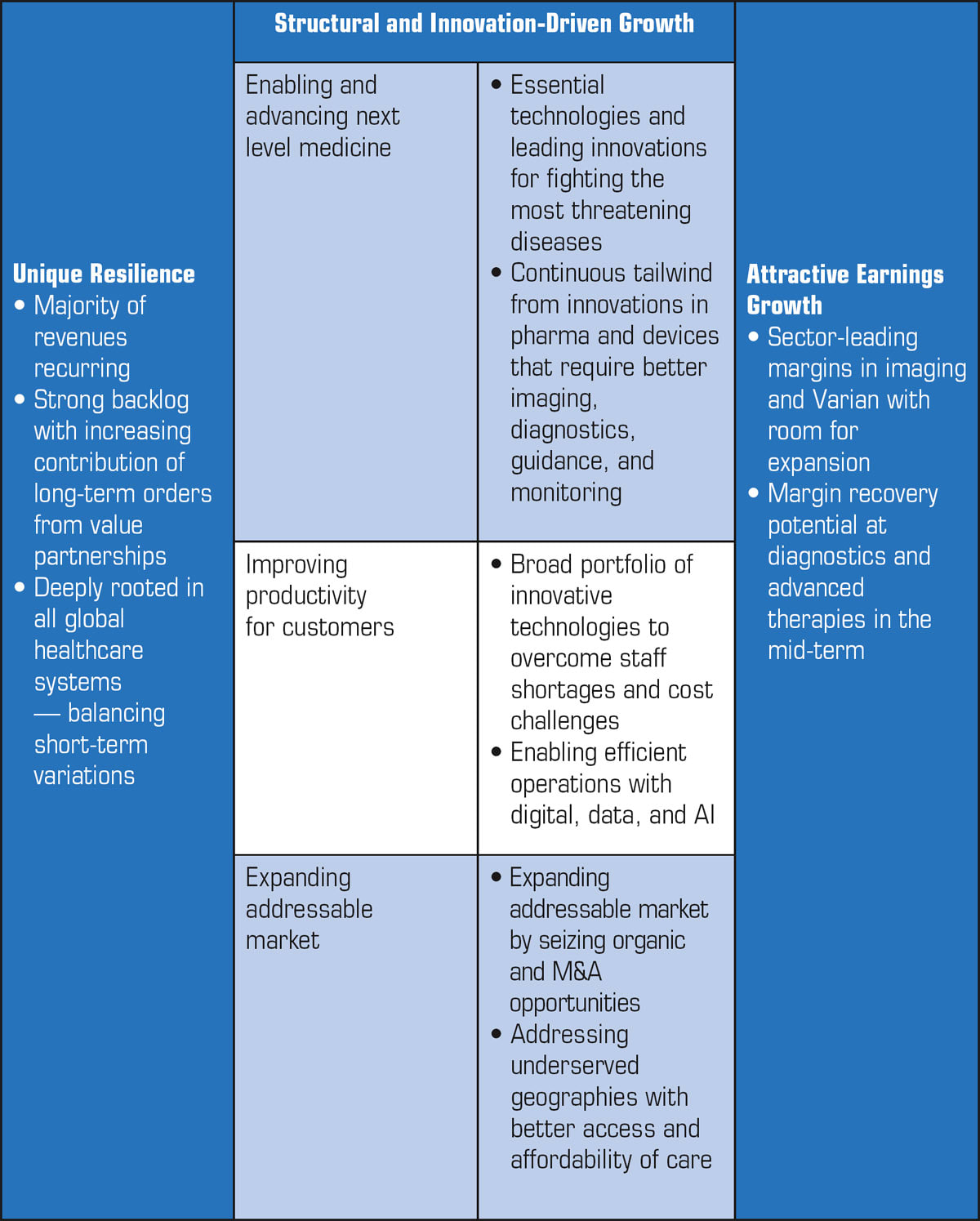 “With our leading portfolio and consistent rollout of innovative solutions, we are convinced we will continue our path of outperforming our markets. The advanced ways of treating the most threatening diseases in cardio, cancer, and neural products and solutions enable next level medicine,” said Montag. “The next-level medicine such as pharma and device innovations often drive our procedure growth.” Table 1 details the company’s strategy for growth.