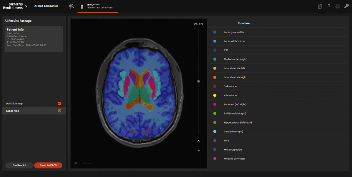 The AI-Rad Companion Brain MR for Morphometry Analysis automatically segments the brain in MRI images, measures brain volume, and marks volume deviations in result tables used by neurologists for diagnosis and treatment. AI-Rad Companion Prostate MR for Biopsy Support automatically segments the outer contour of the prostate on MRI images and enables radiologists to mark lesions, so that it’s easier for their colleagues in urology to perform targeted prostate biopsies. Both applications can be used on MRI scanners from different manufacturers and are available on teamplay, Siemens Healthineers’ cloud-based healthcare platform.