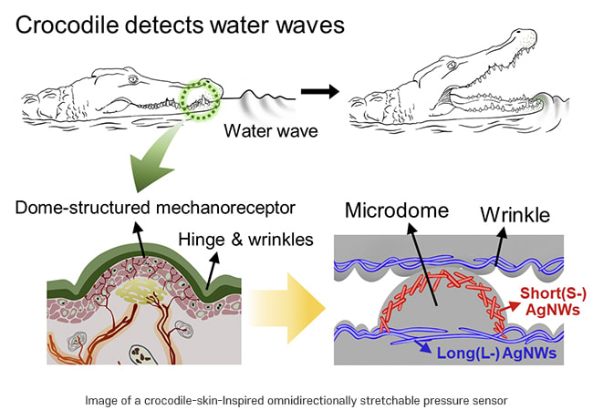 Researchers have successfully created omnidirectionally stretchable pressure sensors inspired by crocodile skin. They drew inspiration from the unique sensory organ of crocodile skin and developed pressure sensors with microdomes and wrinkled surfaces.