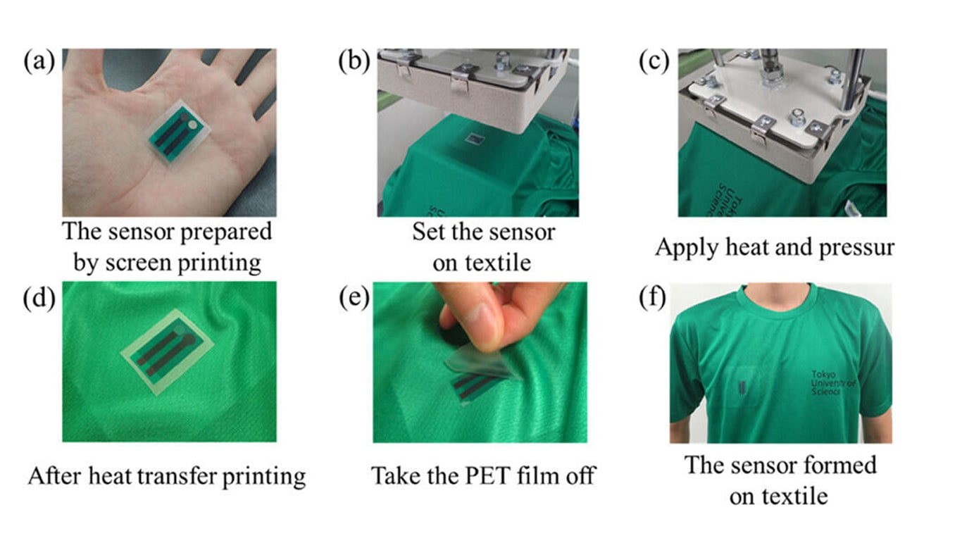 An innovative sweat biosensor uses a technique called heat-transfer printing to fix a thin, flexible chloride ion sensor onto a textile substrate. The biosensor can be transferred to fiber substrates, and thus can be incorporated into textiles such as T-shirts, wristbands, and insoles.