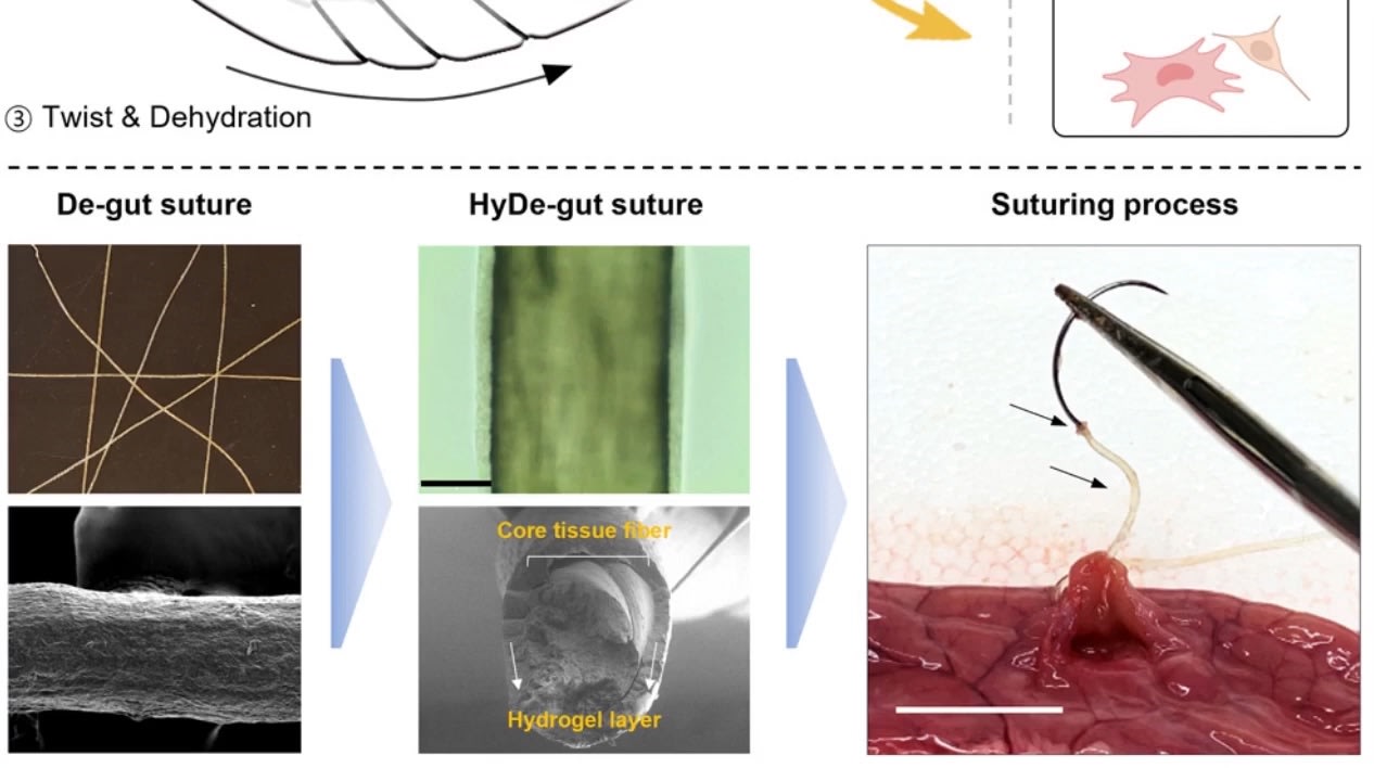 After dehydrating the tissue and twisting it into strands, the researchers evaluated its tensile strength — a measure of how much stretching it can withstand before breaking — and found that it was comparable to commercially available catgut sutures. They also found that the De-gut sutures induce much less of an immune response from surrounding tissue than traditional catgut.