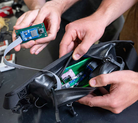 Everything is written to a micro-SD card. The system includes a lidar scanner mounted on a tripod that can map the layout of a room, including the furniture. The lidar scanner sends out a signal and detects where the walls are. (Image credit: Brandon Martin/Rice University)
