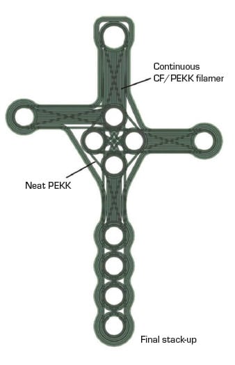 Based on the software design and due to the critical position and dimensional stability of aiming arm holes for positioning surgical tools, aligned fibers (UD tapes) were used to reinforce the holes. The tapes were also used along predicted load paths as well as the external perimeter to strengthen through-thickness resistance to out-of-plane flexure. Additionally, stiff face skins were implemented to create a sandwich structure surrounding the bulk volume of the part, which was filled with unreinforced PEKK. This added step enabled tough exterior surfaces for post-print deburring, polishing, and engraving.