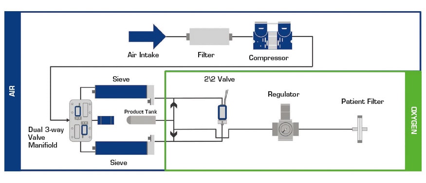Both stationary and portable oxygen concentrators typically use solenoid valves to control the flow of air into the unit and the delivery of oxygen-rich air to the patient. As portable concentrators continue to shrink in overall size and weight, developers continue to seek new flow-control solutions that provide high flows in very compact sizes. Besides a high flow-to-size ratio, other key features designers look for include low power consumption (to extend battery life), quiet operation (patient comfort) and extremely long cycle life (long-term reliability).