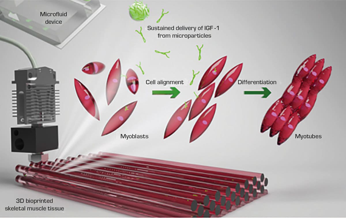 Preclinical studies were carried out with mice receiving implants of 3D bioprinted muscle tissue constructs. Those mice implanted with muscle tissue constructs that offered sustained release of IGF-1 exhibited the highest degree of muscle tissue regeneration six weeks after implantation.