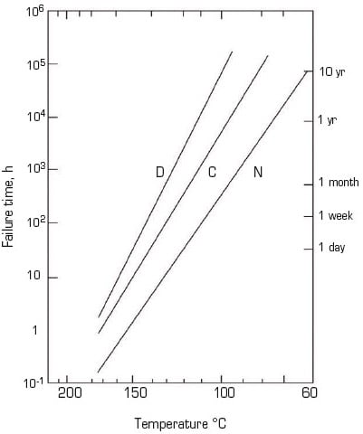 The chart most often referred to for the Parylenes can be seen in Figure 1 and plots the failure points as the log of time versus temperature. Failure points are defined as a 50 percent loss in tensile strength, the resulting curve being based on an Arrhenius extrapolation. Temperature data from this chart provides estimated thermal endurances for Parylenes N, C, and D.