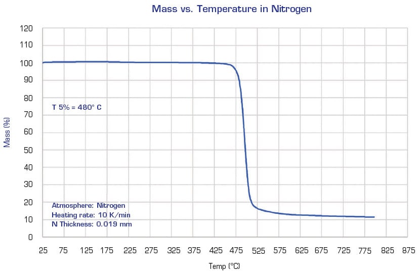 When the environment is air (Figure 2), the T5% value for Parylene N is 327 °C. In a nitrogen environment (substantially oxygen free) the thermal stability of Parylene N improves further. This improvement can be seen in Figure 3, which illustrates a T5% value of 480 °C.