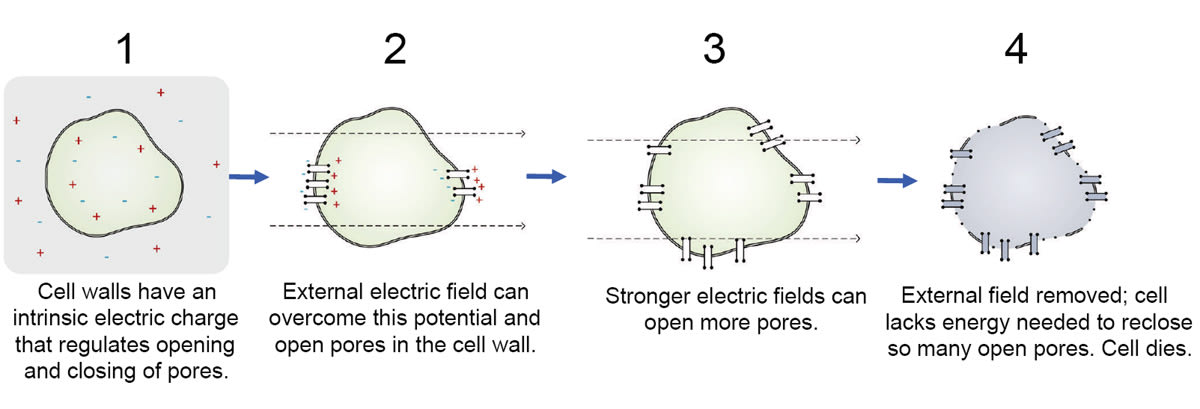 Unlike thermal modalities (which rely on heat), PFA relies on the use of the electric fields. Rather than a macro-scale thermal process, it is a micro-scale, cellular-level process. Electric fields can cause the opening of cellular pores, which can become stuck open, depleting the cell of needed energy, and resulting in cell death. Through adjustment of the electric field strength, the number of pores opened can be controlled. While superficially the same (insofar that it involves a source of electric current and a conductive catheter), it is radically different in its mechanism of action. Figure 2 illustrates the PFA mechanism of action at a cellular level.