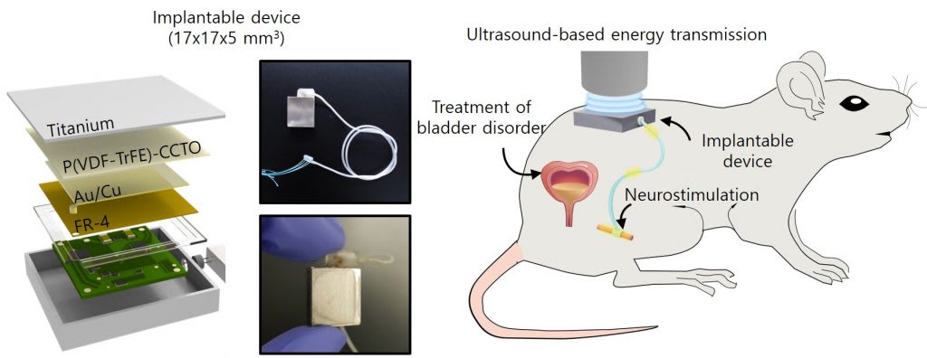 Using this technology, the research team created an implantable neurological stimulator powered by ultrasound-based energy transmission, eliminating the need for batteries. This was confirmed through experimental validation. In animal model trials, the device was activated even at standard imaging ultrasound levels (500 mW/cm2), imposing minimal strain on the human body. Furthermore, it effectively mitigated symptoms related to abnormal urination caused by overactive bladder disorders through nerve stimulation. (Image credit: Clayton Metz for Virginia Tech)
