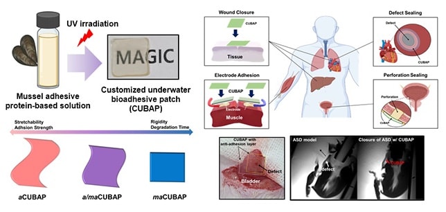 A team has developed medical adhesives that are not only safe for human use but also customizable for different organs. The researchers used mussel-derived adhesive proteins to develop customized underwater bio-adhesive patches (CUBAP).