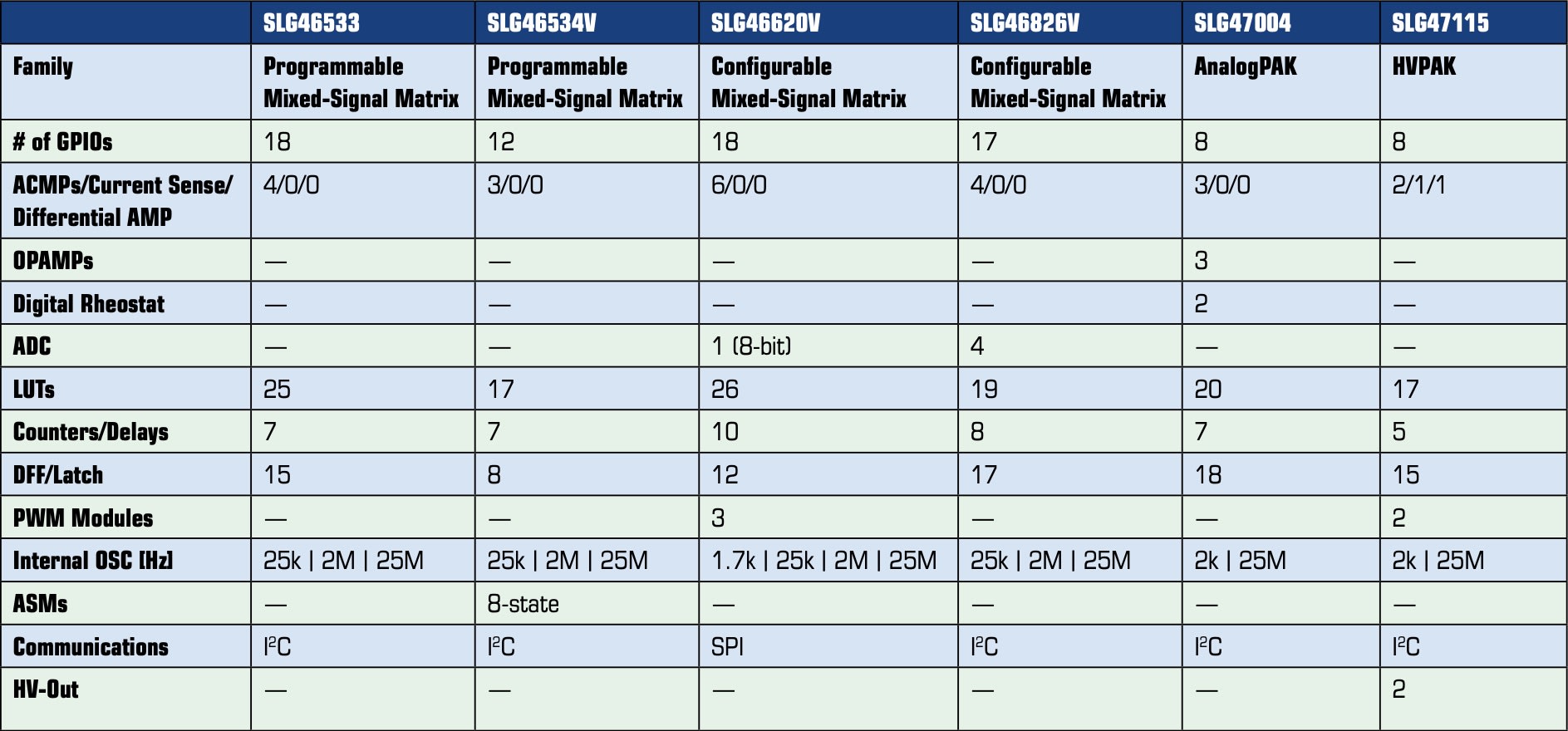 Both of these programmable mixed-signal ICs integrate highly configurable analog and digital components in their different variants, where it can be mentioned analog comparators (ACMPs), operational amplifiers (OPAMPs), PWM modules, rheostats, look-up tables (LUTs), clocks, counter/delays, DFFs, asynchronous state machines (ASM) etc.