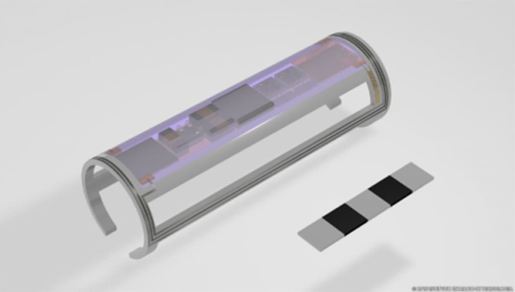 The implanted system will be connected to and powered by an external data collection and communication system, either through standardized wireless technology or simply via a smartphone for asynchronous on-demand monitoring. The platform's extremely small size should facilitate future implantation via simple catheterization on a peripheral vein.