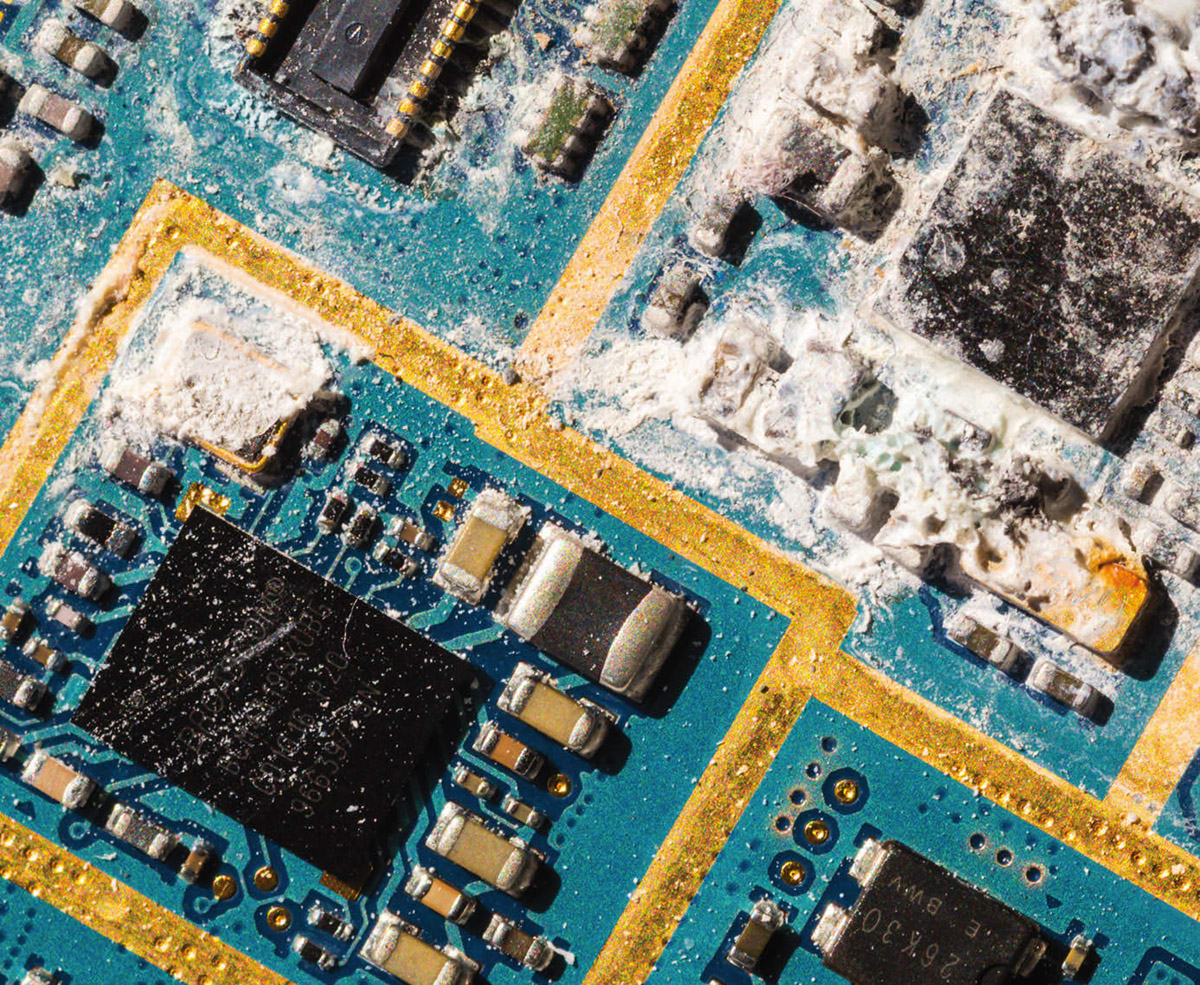 Particulate: Commonly present on PCBs, particulate contamination varies in size from submicroscopic to visible debris such as dust, dirt, fibers, and metal chips. Electrostatically adhered to PCB surfaces, particulates need an electrostatic polar cleaning fluid to disrupt the bond and displace them. Added agitation, such as vibrating ultrasonic energy or boiling action, aids in enhancing the cleaning fluid’s effectiveness in removing insoluble contamination.