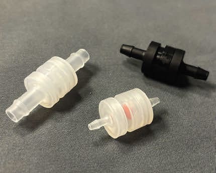 Air Logic, Racine, WI, has created low cracking force in-line non-return valves. The plastic bodies with preloaded elastomer umbrellas are designed to mitigate the common problems of previous check valves, such as chemical attacks and inconsistent performance. The polypropylene and silicone model was engineered specifically for the medical device industry to be compliant with industry ratings such as ISO 10993 and avoids the incorporation of common conflicting materials such as BPA. There are preset options of cracking pressures under 2 psi with five different barb sizes, as well as the option to customize