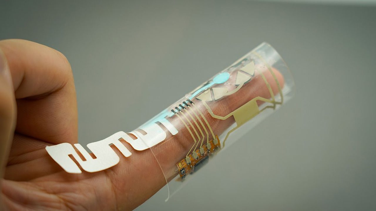 The device is constructed from several electronic components printed onto a thin, flexible and stretchable polymer material. Its design allows it to conform to the finger while being durable enough to withstand repeated bending, stretching and movement. “It is based on a remarkable integration of energy harvesting and storage components, with multiple biosensors in a fluidic microchannel, along with the corresponding electronic controller, all at the fingertip,” said Wang.