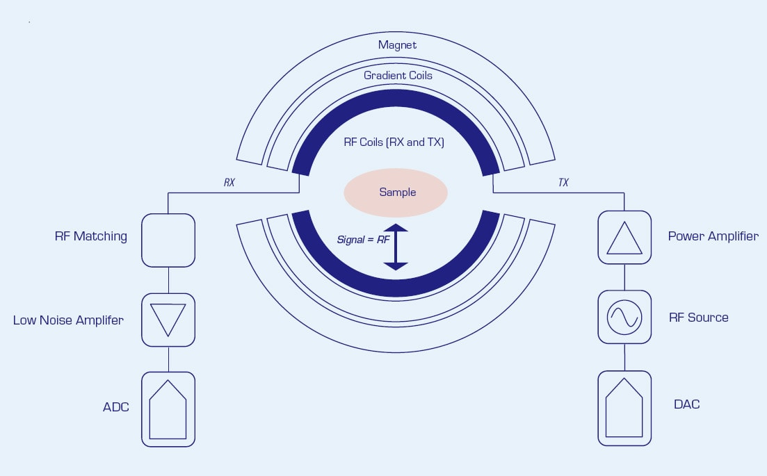 RF coils transmit RF pulses to disrupt the gradient and detect returning signals during relaxation. Meanwhile, an RF transmitter and receiver support their function by generating, detecting, and amplifying the RF signals for further analysis. A control computer is responsible for both managing these operations and storing image data.