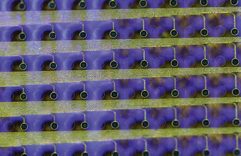 The team used gallium nitride to develop a manufacturing technique for high-efficiency LEDs that do not heat up when they light up and do not damage brain tissues. The embedded thousands of LEDs in flexible films and release them from the substrate in the form of a flexible display panel. They then used inkjet printing to deposit quantum dot inks on the surface of the LEDs to convert their blue light to multiple other colors. (Image credit: UCSD)