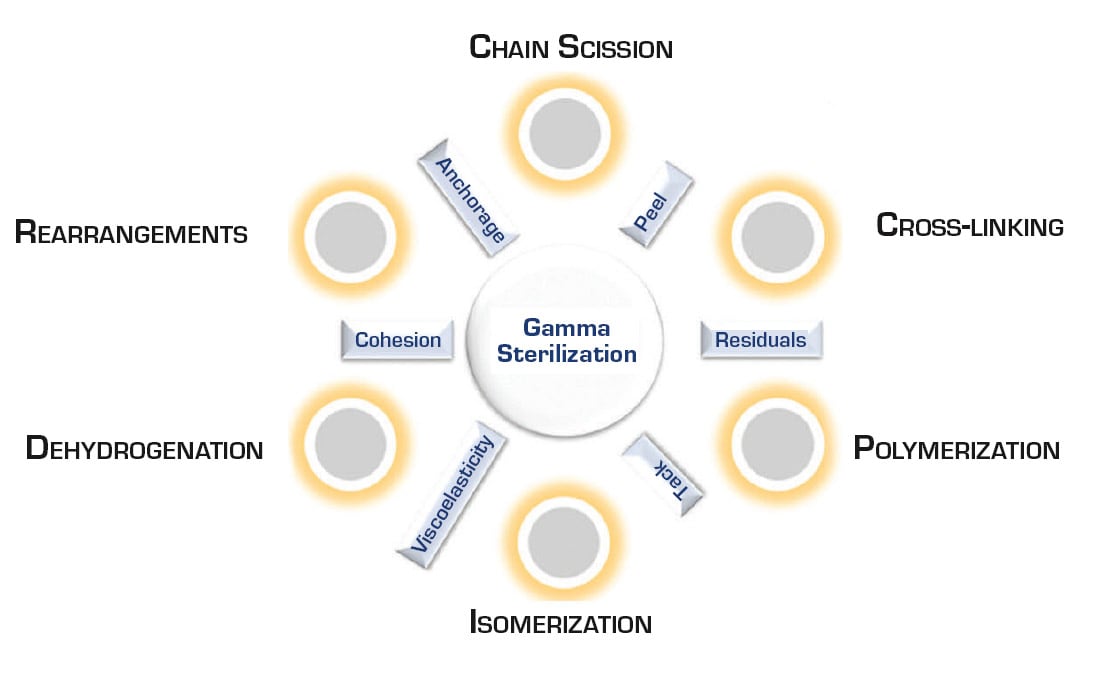 Traditional silicone PSAs are perfect for skin but not quite perfect for use in all medical device applications. Silicone polymers and elastomers are not stable to ionizing radiation, like gamma. Silicone generally is not the least stable material when compared to other materials for stability under gamma radiation at sterilization doses; however, silicone PSAs are highly affected. The potential reactions from gamma exposure are summarized in Figure 1.
