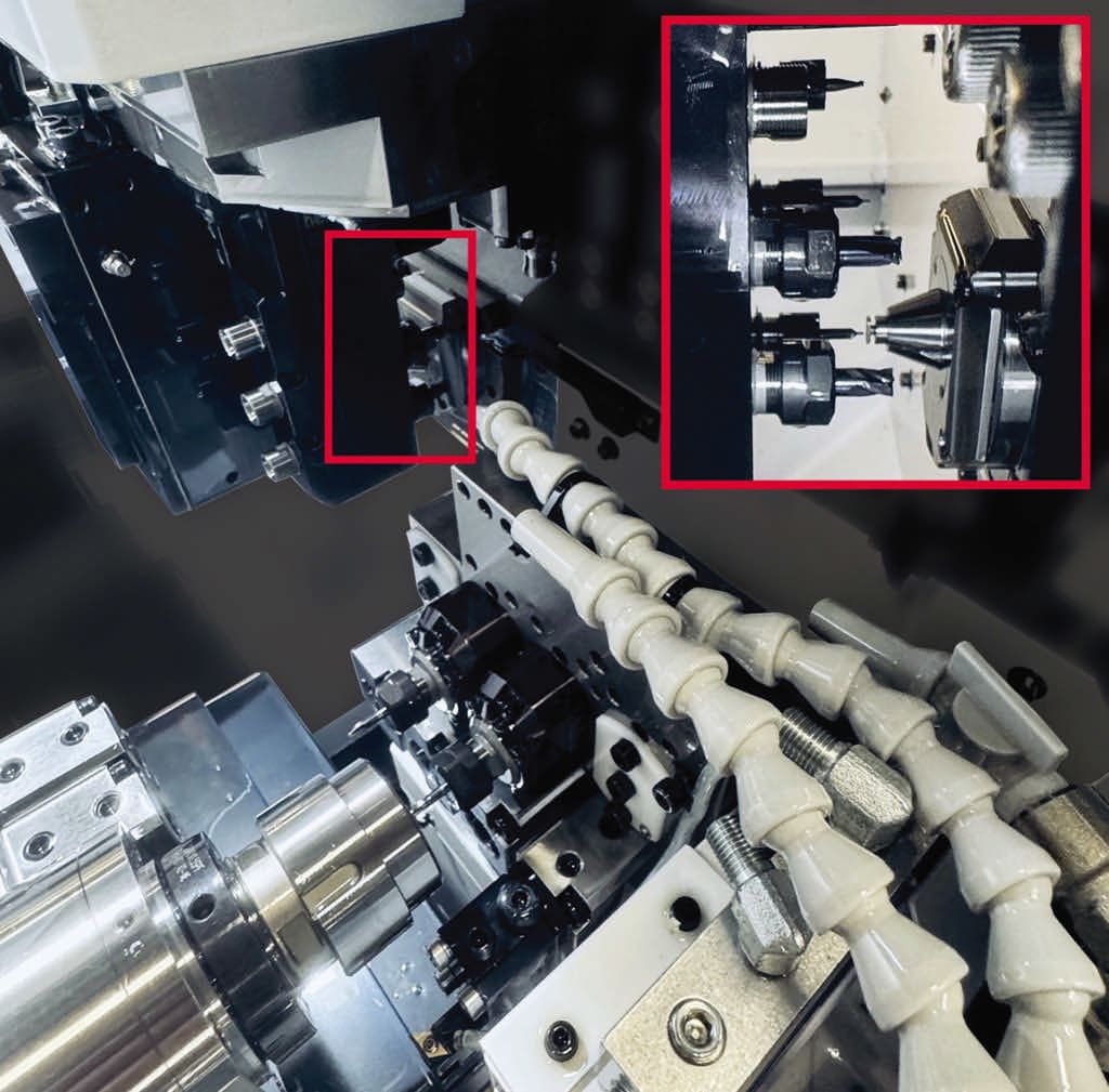 “This prevents crashes into the cutoff or sub-spindle tooling, if setup or offset incorrectly. Together with our team’s tribal knowledge, we designed custom tools that spot, drill, ream and chamfer all with a single tool, keeping the chamfers concentric, as well as the custom deburring tools providing burr-free product. These were all conditions that we struggled with on most on the mills with their need for manual deburring and several tools intersecting the same feature.”