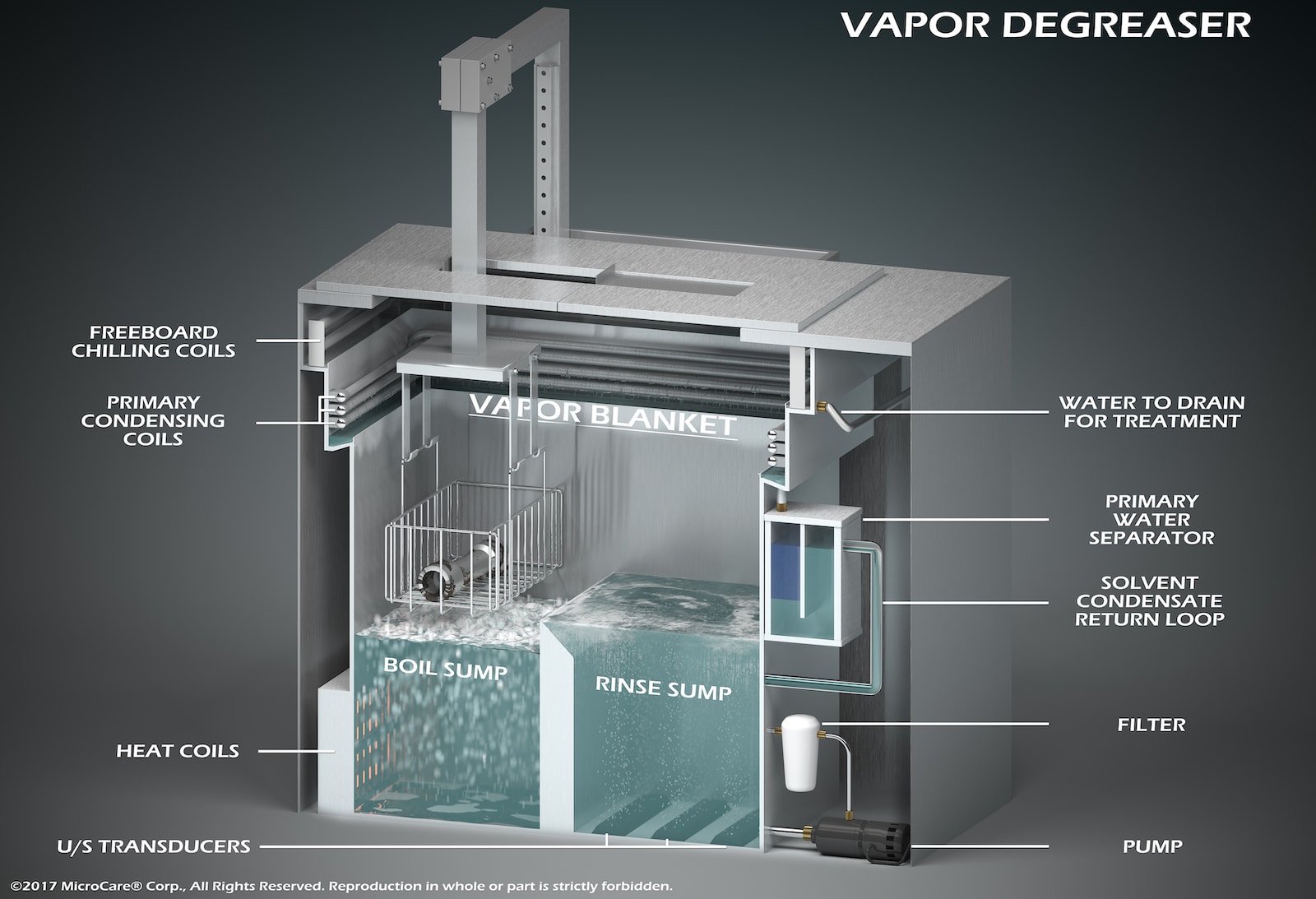 00:00:02 Vapor degreasing is an industrial cleaning process, used to thoroughly clean and dry precision parts. It's safe, cost-effective and environmentally friendly. Vapor degreasing is a common cleaning process utilized by many industries because it's safe, fast, simple and affordable. Compact, efficient two sump degreasers boil a solvent producing a vapor. The cold primary condensing coils contain these vapors by cooling the vapors back into a liquid, dissolving soils which then drip away by way of gravity. Cleaning fluids are engineered with just the right chemical characteristics, boiling point, specific gravity, surface tension and more; to wet every surface, getting into and out of tiny nooks and apertures to remove tough residues and contaminants.