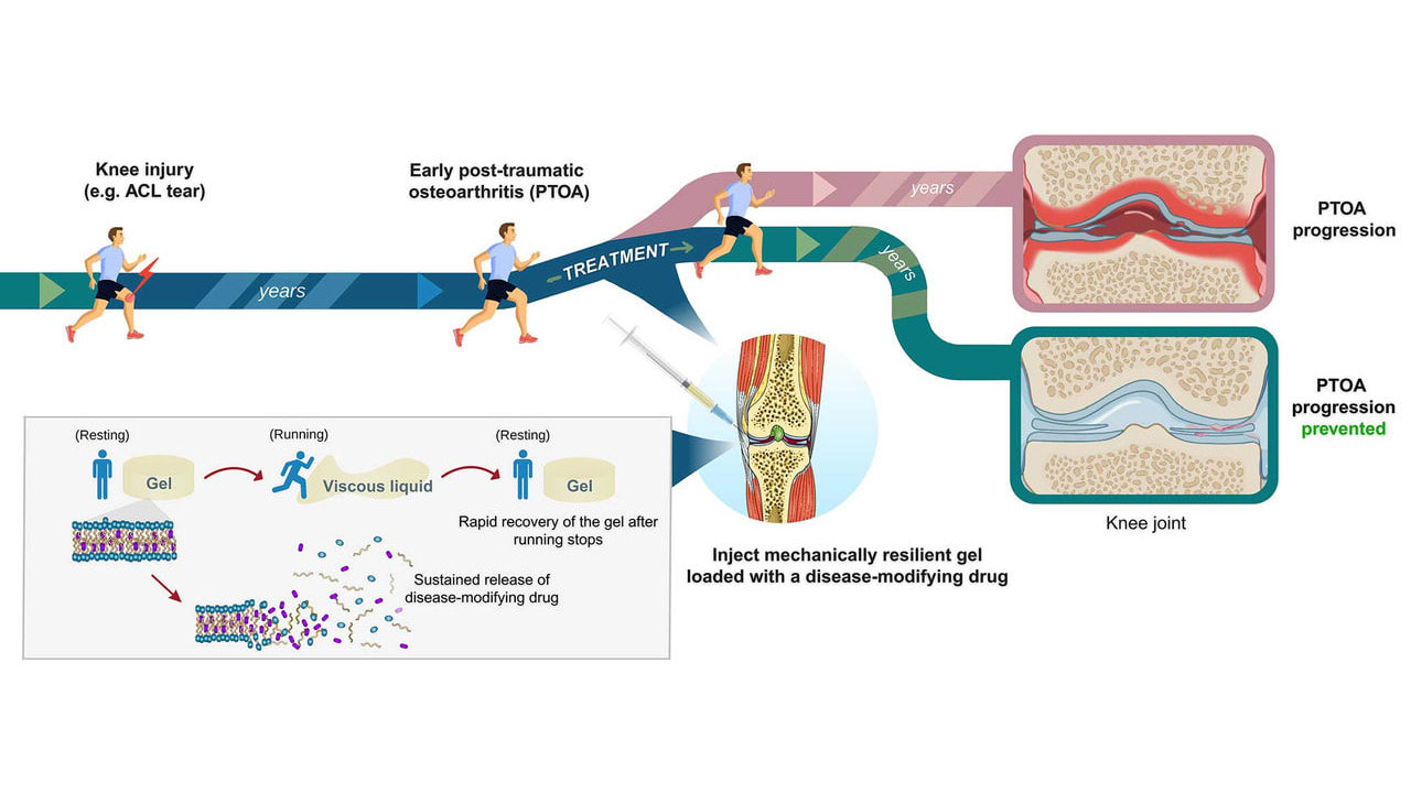 Researchers have created a new hydrogel to improve drug delivery for treating post-traumatic osteoarthritis (PTOA). The hydrogel, which is designed to offer sustained drug release even during continuous joint movement, showed promising results in preclinical studies that mimicked the joint stress of running, highlighting the hydrogel’s potential for treating PTOA in physically active patients.