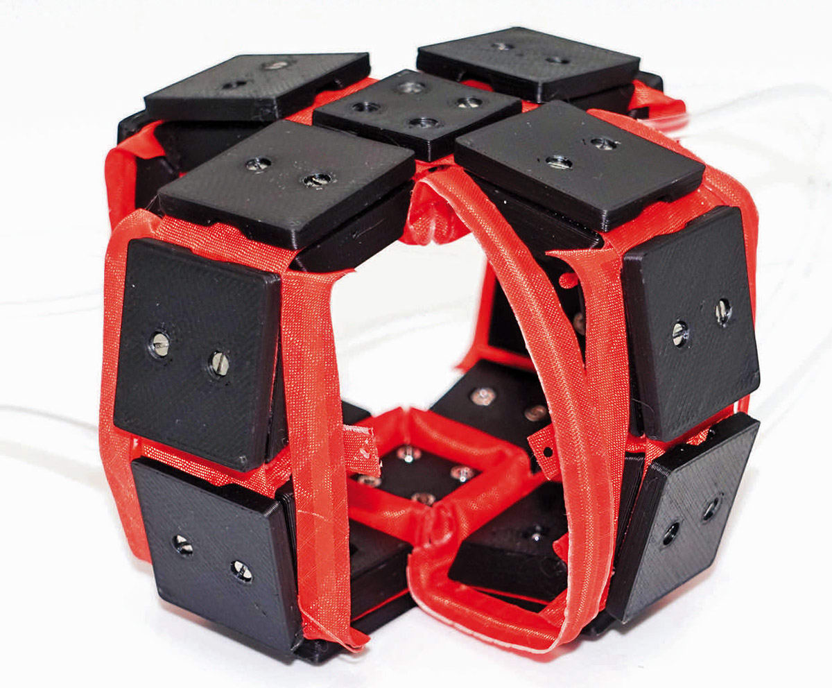 In contrast to its versatile and rather complex 16 possible configurations, the design of the Digits framework, developed in the Reconfigurable Robotics Lab in EPFL’s School of Engineering, is relatively simple. Every configuration is made of multiple modules — or Digits — that are composed of rigid links joined by flexible joints. These joints are controlled by pressurized air pouches to change the modules’ shape and stiffness.