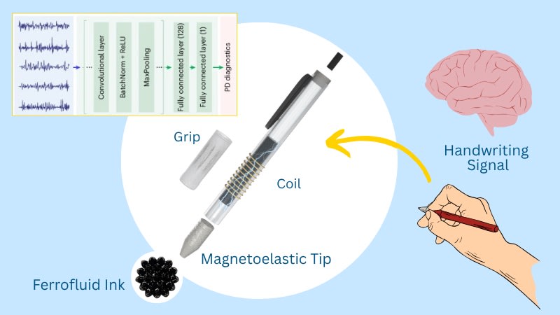 Researchers have developed a smart, self-powered magnetoelastic pen that could help detect early signs of Parkinson’s by analyzing a person’s handwriting. The highly sensitive diagnostic pen features a soft, silicon magnetoelastic tip and ferrofluid ink — a special liquid containing tiny magnetic particles.