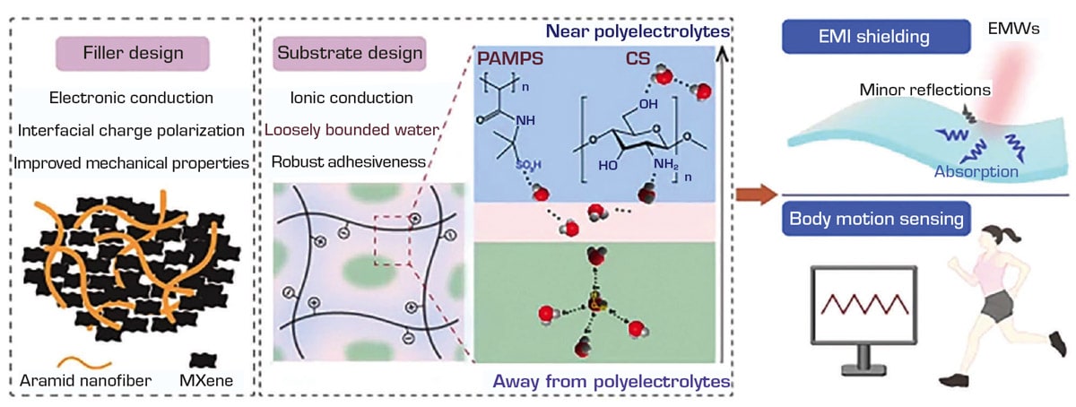 Researchers from Harbin Institute of Technology and their collaborators have developed a multifunctional polyelectrolyte hydrogel reinforced with aramid nanofibers (ANFs) and MXene nanosheets, achieving outstanding performance in absorption-dominated electromagnetic interference (EMI) shielding and wearable sensing. This innovative hydrogel addresses the long-standing challenge of balancing electrical conductivity and effective EMI absorption in flexible electronic materials. The research was published in the journal Nano-Micro Letters. 1