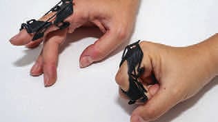 They designed the brace as two rigid pieces connected by an elastic band. The band can easily be released when a patient pushes down on the brace and curls or bends their finger to a certain point, allowing easy movement of the finger. When the patient extends their finger, pushing it up, the elastic band snaps back into place through a similar process and the finger becomes immobilized.
