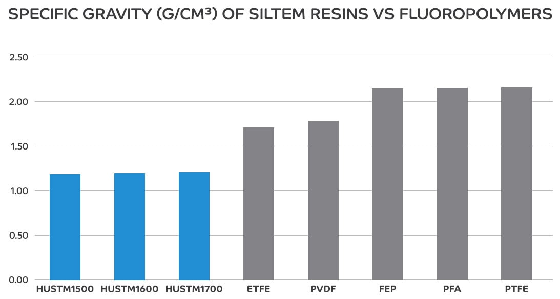 Further, PEI resins and copolymers have lower specific gravities than fluoropolymers, as outlined in Figure 1, which can reduce part weight and raw material costs.