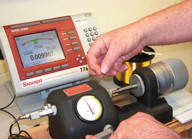 CFW uses bench micrometers from The L.S. Starrett Co. of Athol, MA, to check ultra-finished (polished) wire measuring 2/10,000" in diameter with a tolerance of 25-millionths of an inch. Inspections occur at critical stages of processing; for example, checking incoming wire, at the shaping and coating stages, after manufacturing, and final quality checks.
