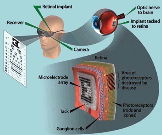 With the artificial retina device, a miniature camera mounted in eyeglasses captures images and wirelessly sends the information to a microprocessor (worn on a belt) that converts the data to an electronic signal and transmits it to a receiver on the eye. The receiver sends the signals through a tiny, thin cable to the microelectrode array, stimulating it to emit pulses. The artificial retina device bypasses defunct photoreceptor cells and transmits electrical signals directly to the retina’s remaining viable cells. The pulses travel to the optic nerve and, ultimately, to the brain, which perceives patterns of light and dark spots corresponding to the electrodes stimulated. Patients learn to interpret these visual patterns.