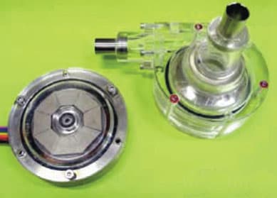 The impeller is 50 mm in diameter and levitates on two thrust bearings (top and bottom) and a radial bearing. The impeller levitates about 20 micrometers, which leads to blood clots and damage to blood cells. After doing fluid dynamic analysis, the design was altered to give it a deeper hydrodynamic groove. The estimated bearing flow was increased, which resolved inter-bearing clotting.