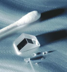 Bern Optics (Westfield, MA) offers submillimeter optical prisms with dimensions to 0.20 mm for use in laparoscopic and endoscopic medical devices. They can be custom-engineered, ground, and polished in a variety of difficult configurations, including optical wedges of any given angle, beam splitter cubes, parallel plates, and custom configurations with combinations of plano, spherical, or cylindrical faces. The microscopic elements — some as small as a grain of salt — are created from optical and filter glasses with minimal edge chipping. They are suitable for use in instrumentation requiring extremely precise optical components.