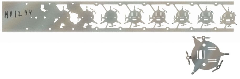 After stamping, the parts needed to be cleaned. However, because they were delicate and had to remain on carrier strips, no options for economical post-process deburring existed. Evans relied on tight tooling clearances in the stamping process to minimize burrs. The strips were cleaned with a biodegradable alkaline degreaser and given a de-ionized water rinse.