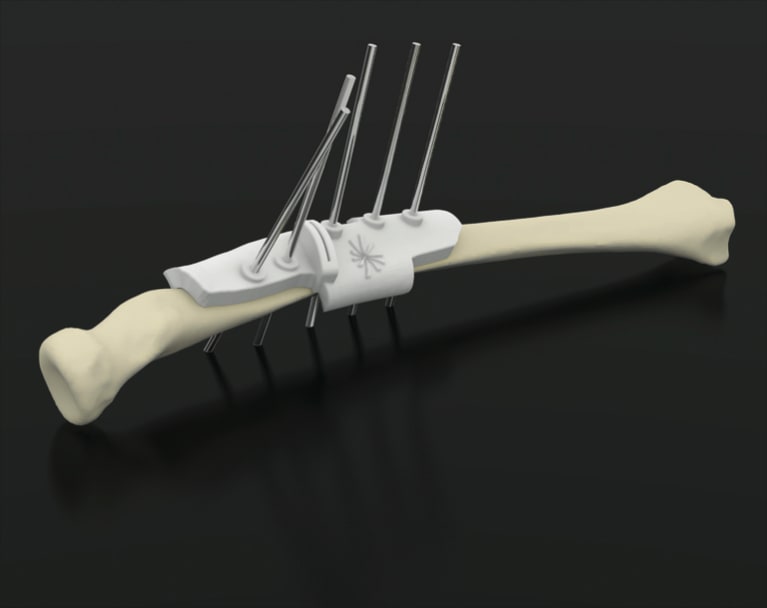 One medical device supplier is currently laser sintering a customizable, disposable drill guide from a biocompatible polyamide thermoplastic (based on PA 12). Starting with a 3D MRI or CT-scan image of the knee, a surgical drill guide (used to pinpoint drilling location) can be designed, and then laser sintered, to reflect a patient’s joint geometry to a tolerance of within a few millimeters (see Fig. 1). Using such guides results in smaller incisions, better-fitting implants, and faster patient recovery. Manufacturing a custom guide for individual patients would be far more expensive — if not prohibitively so — than using traditional manufacturing methods.